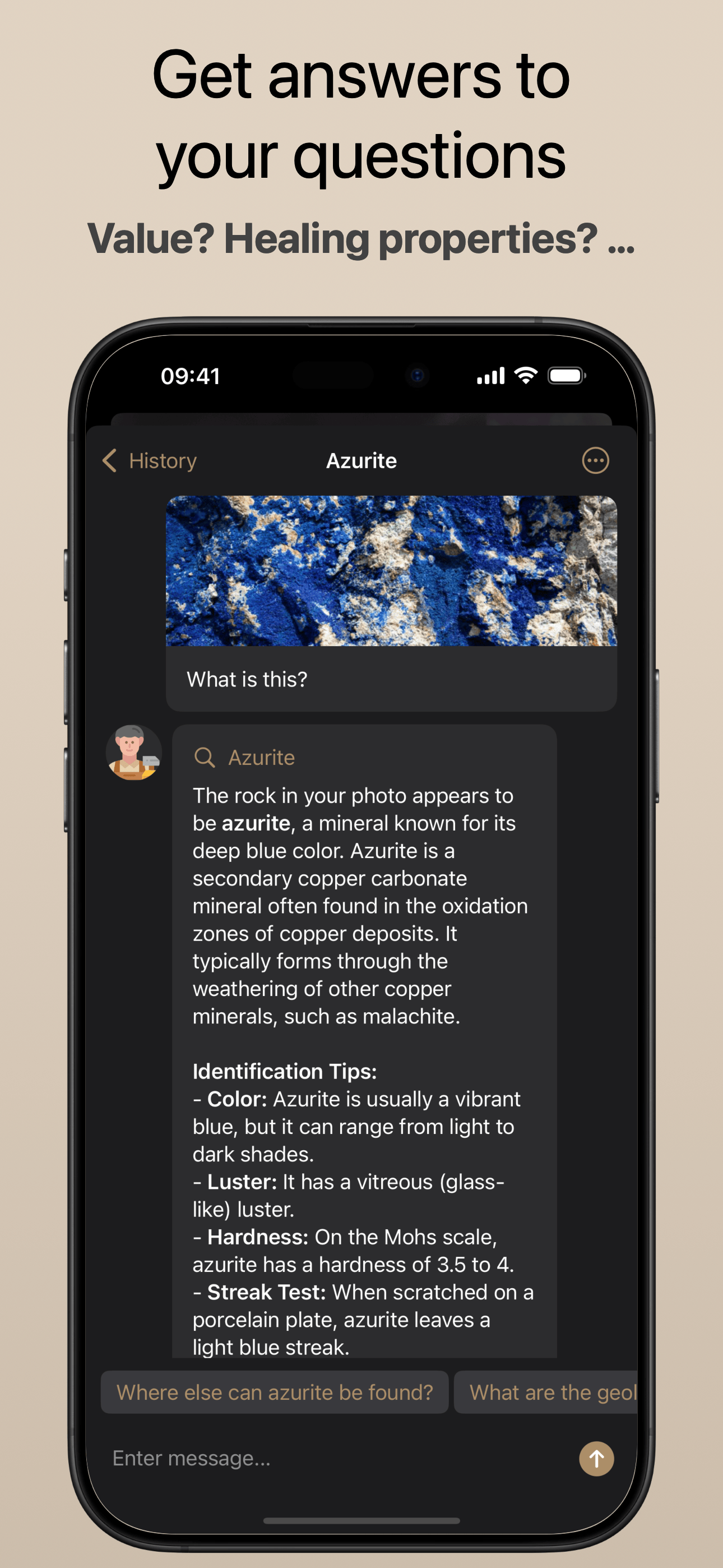 • AI-Powered Identification: Uses state-of-the-art AI to quickly and accurately identify rocks, gems, and crystals from photos.